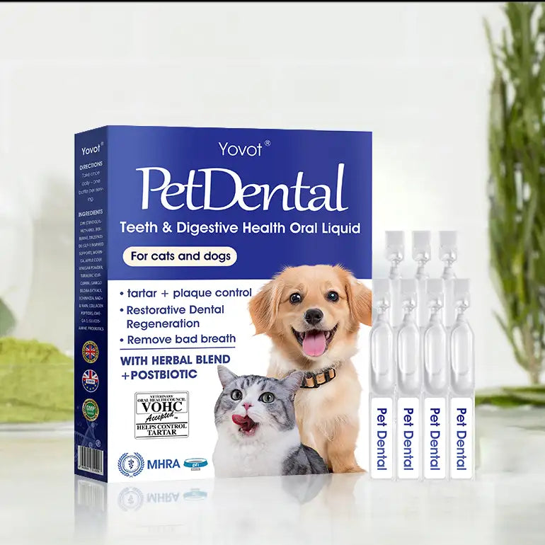 Yovot® Pet Dental & Digestive Health Oral Liquid eliminates 99.99% of bacteria, resolves bad breath, removes plaque and tartar, treats gingivitis, and supports your petâs dental health. This Oral Liquid is formulated with natural ingredients to provide a gentle yet effective way to clean your petâs teeth and promote gum health.